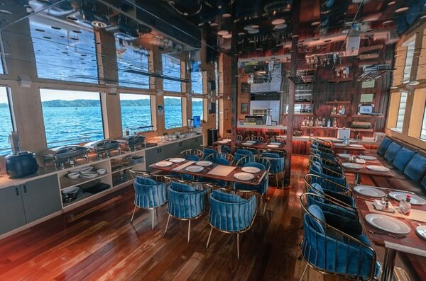 מטבח הספינה מגיש ארוחות טעימות של מגוון סלטים, דגים ופרות ים ומנות בינלאומיות כמו פסטות ותבשילים.